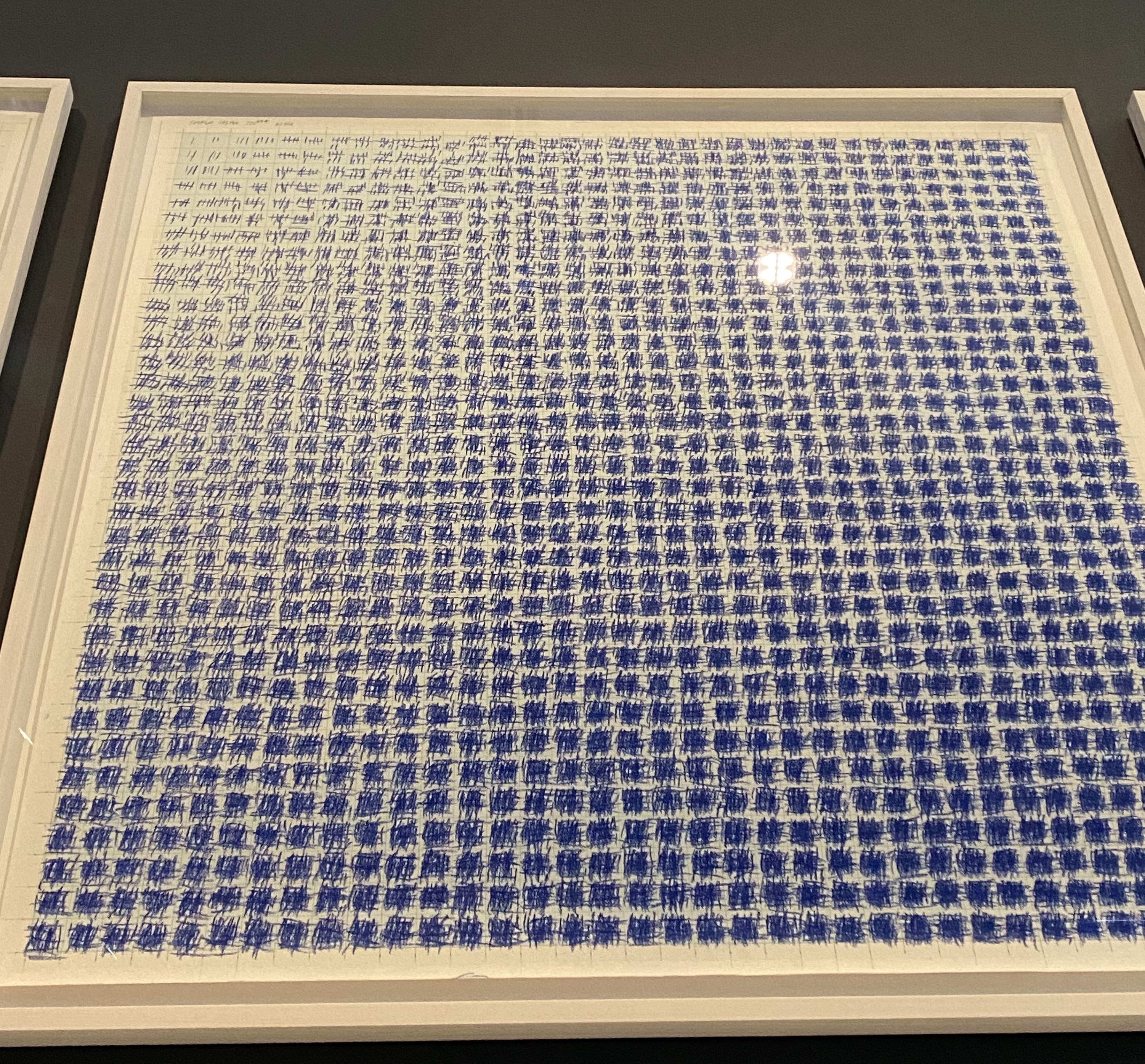 The brain is a remarkable pattern recognition machine. The sense of familiarity that we get when we look at something for a second and we don't know why. I think the name for this is intuition. I had one of these experiences at the exhibit. As we made our way through the diffferent rooms we entered into a space full of different installations and a wall of framed drawings. I make my way around the walls and stumble upon a frame that seems familiar in an unknown way, at first.